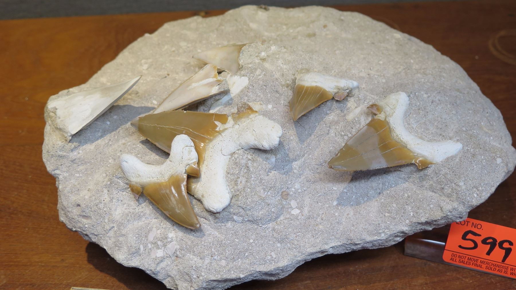 Fossil: 5 fossilized shark's teeth, partially embedded in rock segment. Embedded approx partially fossil teeth segment fossilized across. Shark teeth